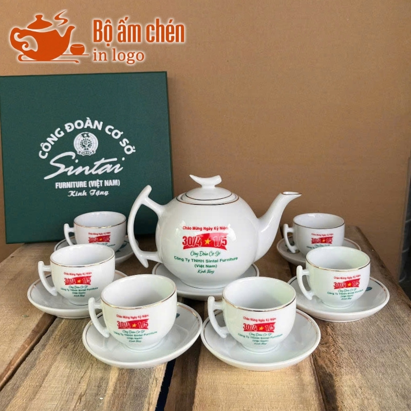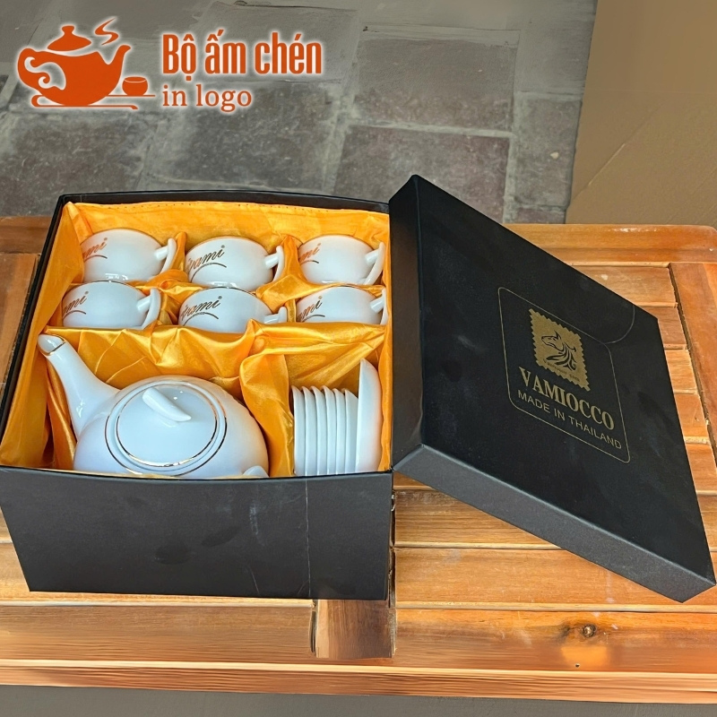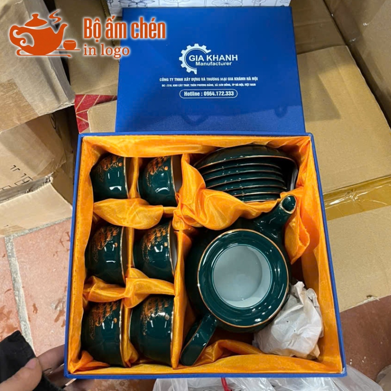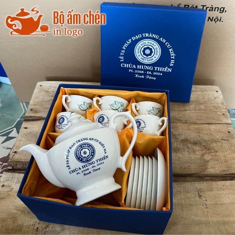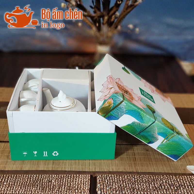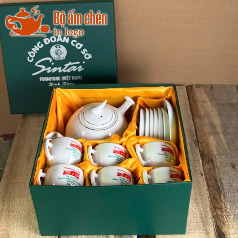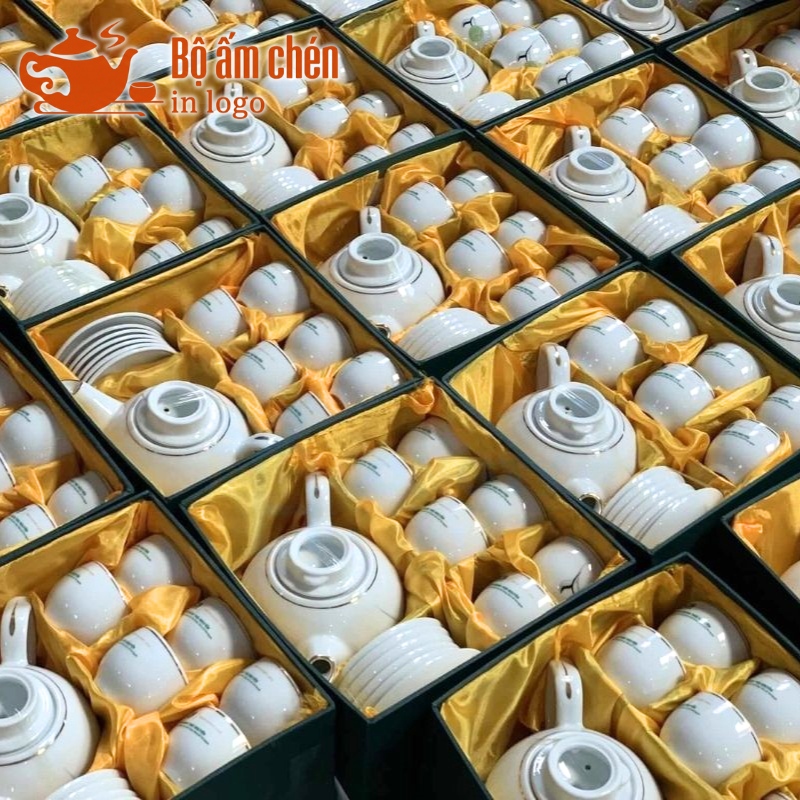 Tổng Kho Ấm Chén Quà Tặng cung cấp trọn bộ ấm chén in logo kèm hộp quà đồng bộ, chuyên nghiệp