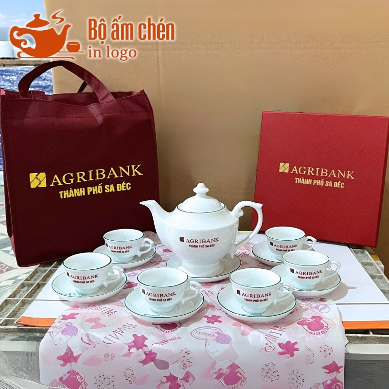 Bộ trà sứ trắng kèm hộp carton định hình in logo do Kho Ấm Chén Quà Tặng thiết kế cho chiến dịch quảng bá của AGRIBANK