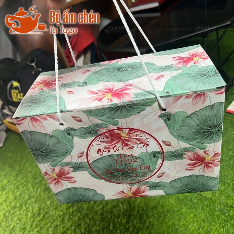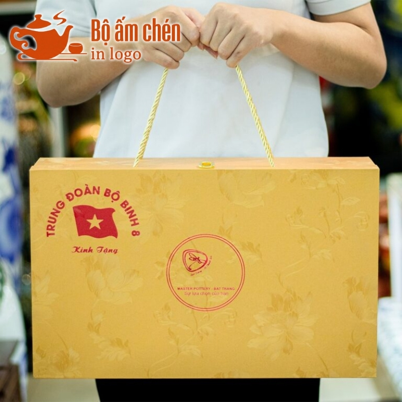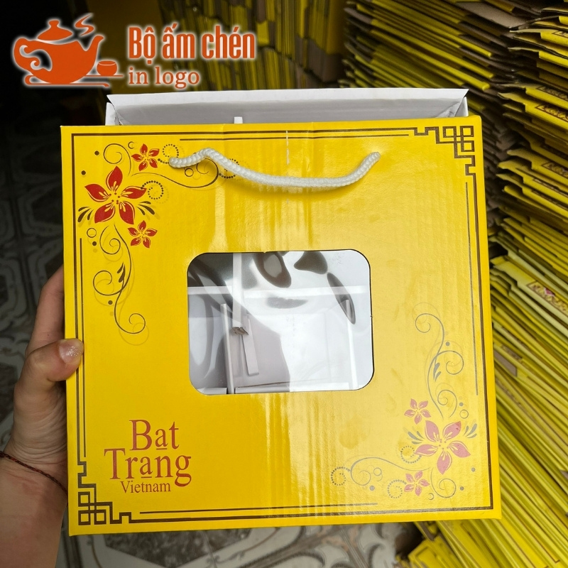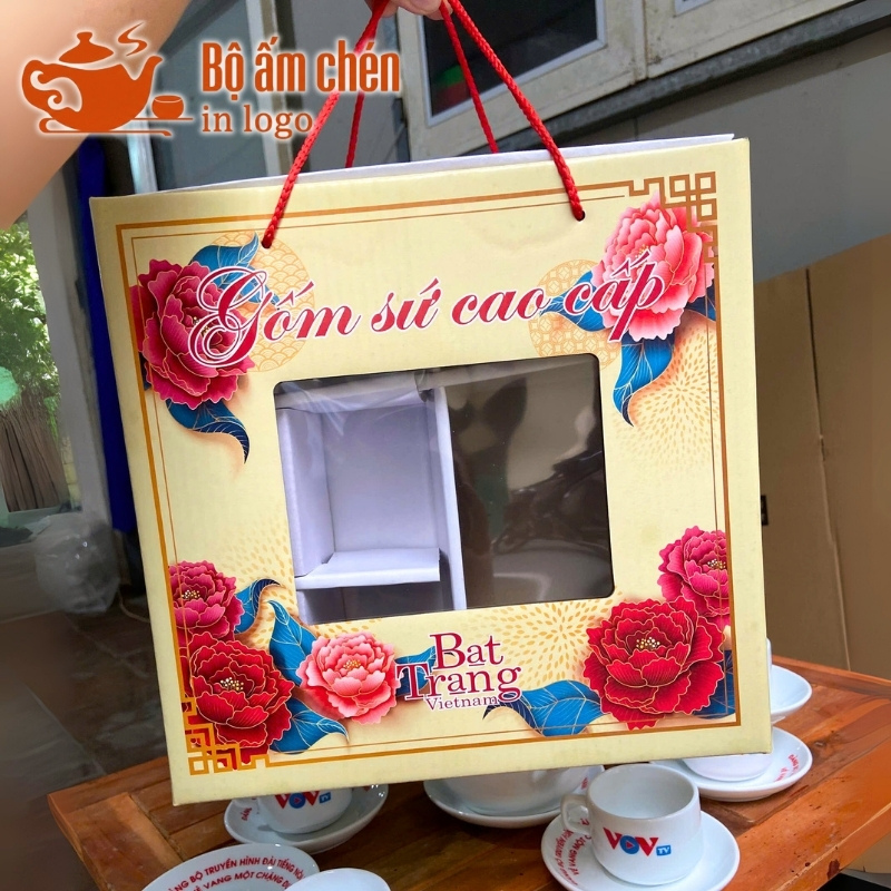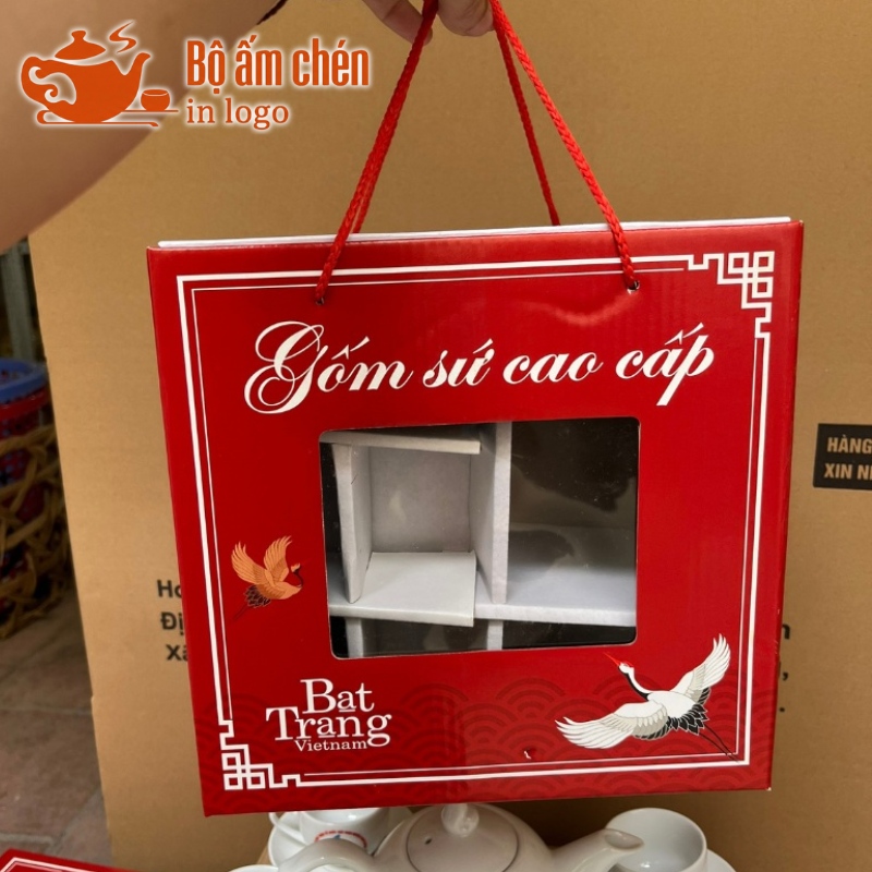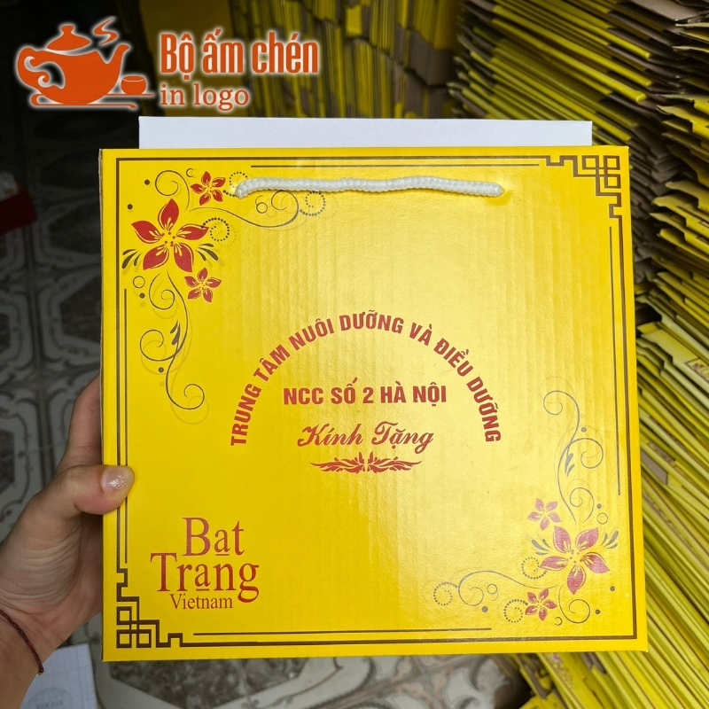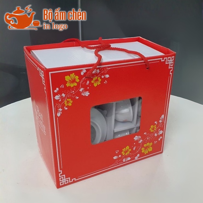 Kho Ấm Chén Quà Tặng hỗ trợ in logo và thông điệp sắc nét lên hộp carton quai xách đựng ấm chén