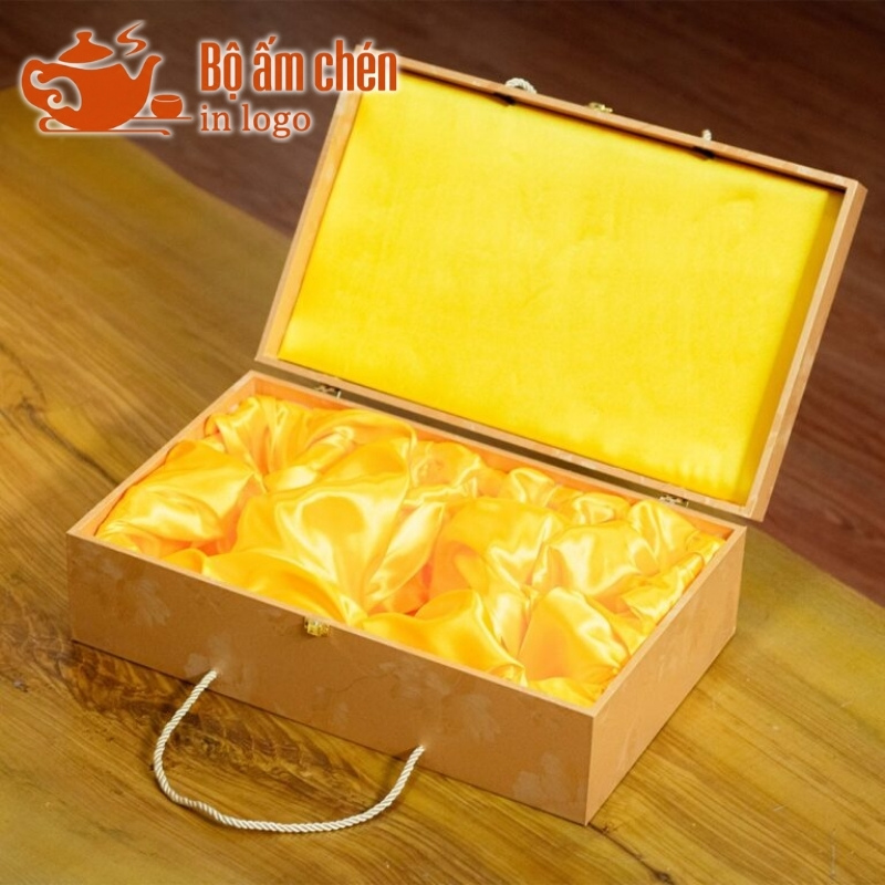 Mẫu hộp xi lót lụa vàng sang trọng, có in ấn logo đồng bộ với bộ ấm tách trà