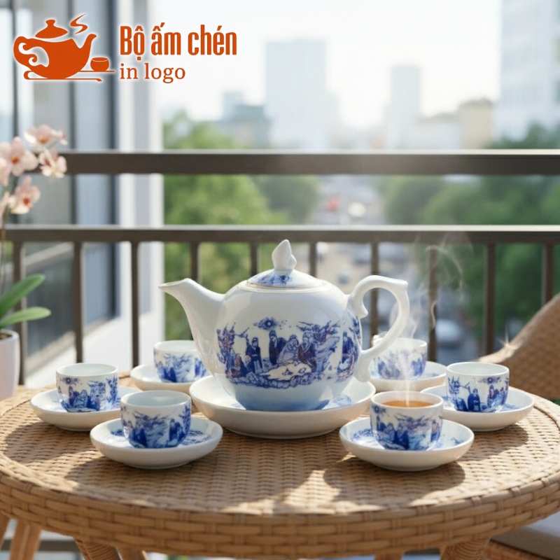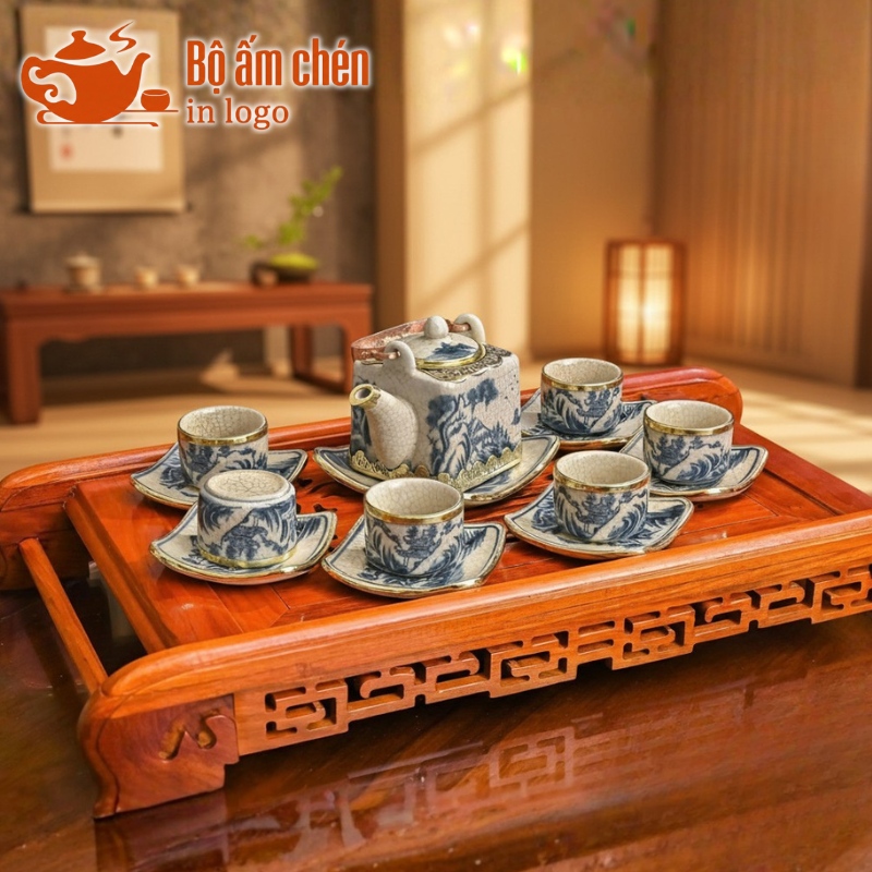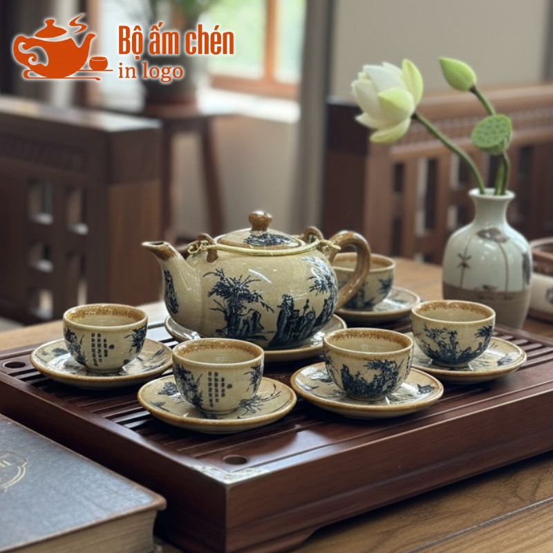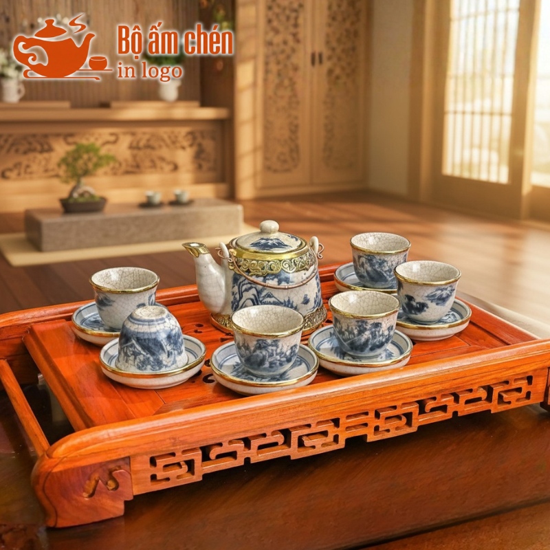 Dòng ấm chén men lam truyền thống sử dụng màu men xanh lam vẽ họa tiết tinh xảo dưới lớp men bóng trắng. Đây là dòng men kinh điển nhất của làng nghề Bát Tràng, mang vẻ đẹp tri thức và phong thái thanh cao. Họa tiết vẽ tay thường là các hình ảnh sơn thủy, hoa sen, tượng trưng cho hồn cốt dân tộc Việt Nam.